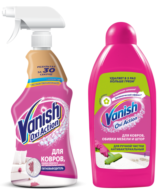 Ковры можно чистить вручную или с помощью пылесоса. В зависимости от выбранного способа можно добавить в список бытовой химии на месяц Vanish шампунь для ковров для моющих пылесосов или для ручной чистки. Обивку мягкой мебели лучше не подвергать чрезмерному воздействию воды, а обработать загрязнения спреем-пятновыводителем для ковров и обивки мебели Vanish Oxi Action с удобным триггером для распыления.