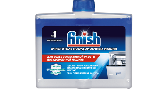 Загрязнения, в том числе жир, известковый налет и остатки пищи, могут оседать на внутренних частях посудомоечной машины, забивать фильтр и форсунки, способствовать появлению неприятного запаха. Жидкий очиститель Finish® для посудомоечной машины удаляет известковый налет и остатки жира из труднодоступных мест в технике.