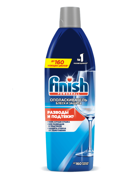 Ополаскиватель Finish® ускоряет процесс сушки, придает посуде блеск и не допускает появления разводов на тарелках и бокалах.